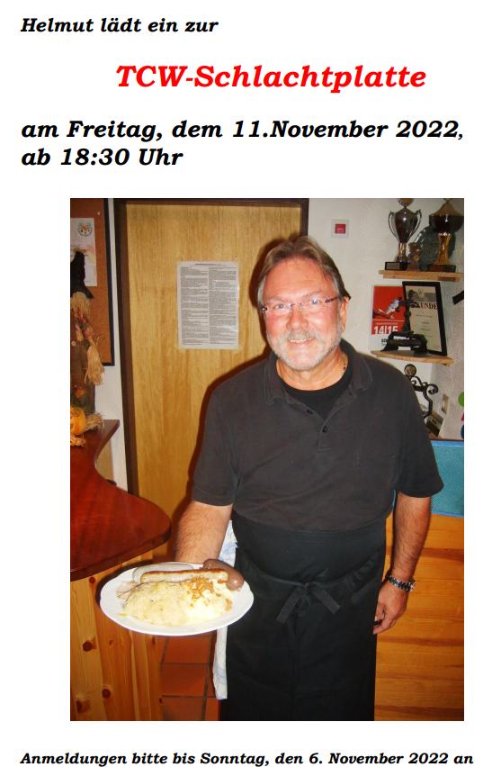 2022 konnte endlich wieder das Schlachtplatten-Essen stattfinden. Bekocht und umsorgt wurden die Gäste wie immer von Helmut Schlenker. Die Vorstandschaft bedankt sich nochmals auf diesem Wege bei Helmut, ohne den es schlichtweg nicht zu stemmen wäre. Insgesamt erhielt man im Vorfeld knapp 50 Anmeldungen, die letztlich für ein volles Tennnisheim mit guter Stimmung bei gemütlicher Atmosphäre sorgten.